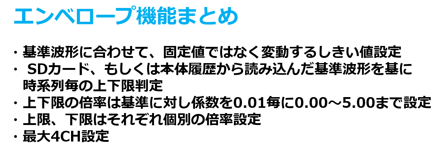 エンベロープ機能を活用すれば、基準波形に対して上限、下限の倍率を入力することでレーザ出力変化後の波形に追従する形でしきい値が設定されるため、前半、後半ともに異常を検知することができます。